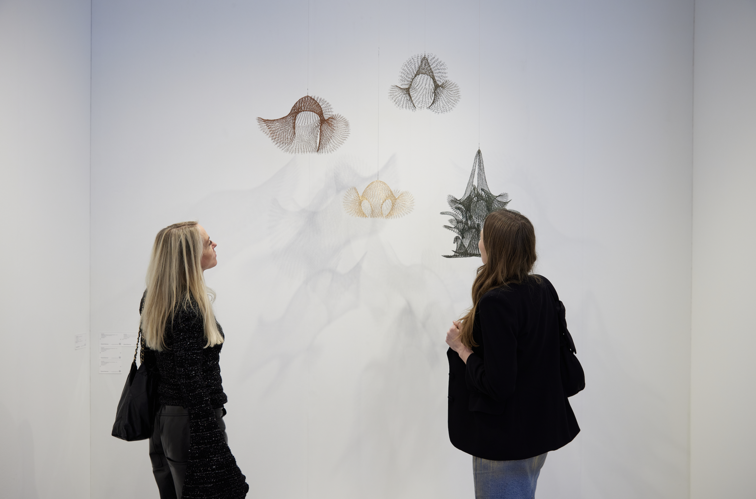 Laura Smith Sweeney and Meghan O'Callaghan looking at a sculpture by Ruth Asawa in David Zwirner’s booth at Fog Fair 2024