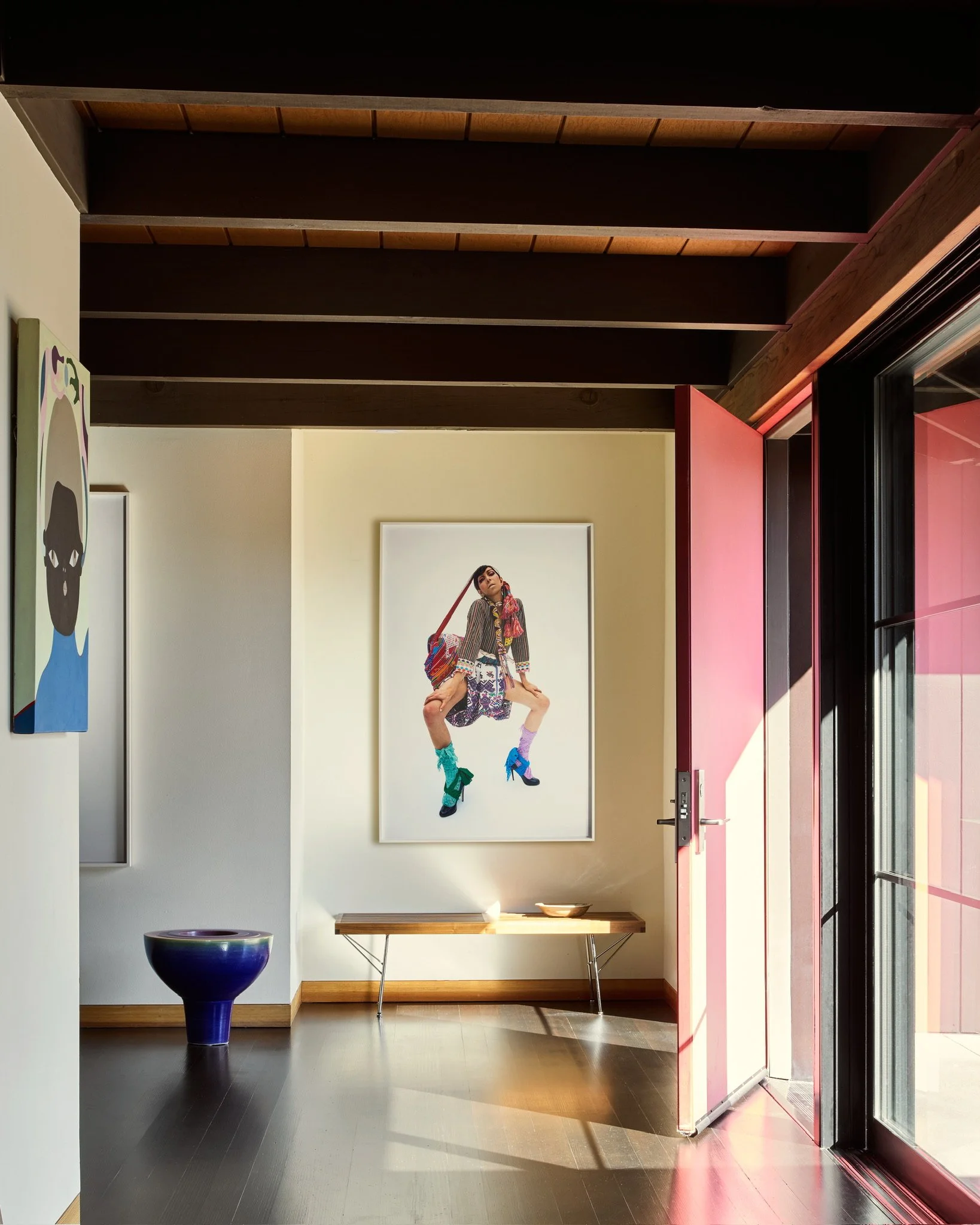 In the entryway, two works confront and reframe the gaze. On the left, Untitled (2023) by Asuka Anastacia Ogawa renders a meditative figure in layered, dreamlike hues. On the right, Martine Gutierrez’s Neo-Indeo, Glamour is a Heavy Burden (2018) takes the form of a high-fashion editorial, boldly inserting the artist’s image into spaces historically shaped by exclusion. Together, the works establish a tone of agency, transformation, and self-possession from the moment of arrival.