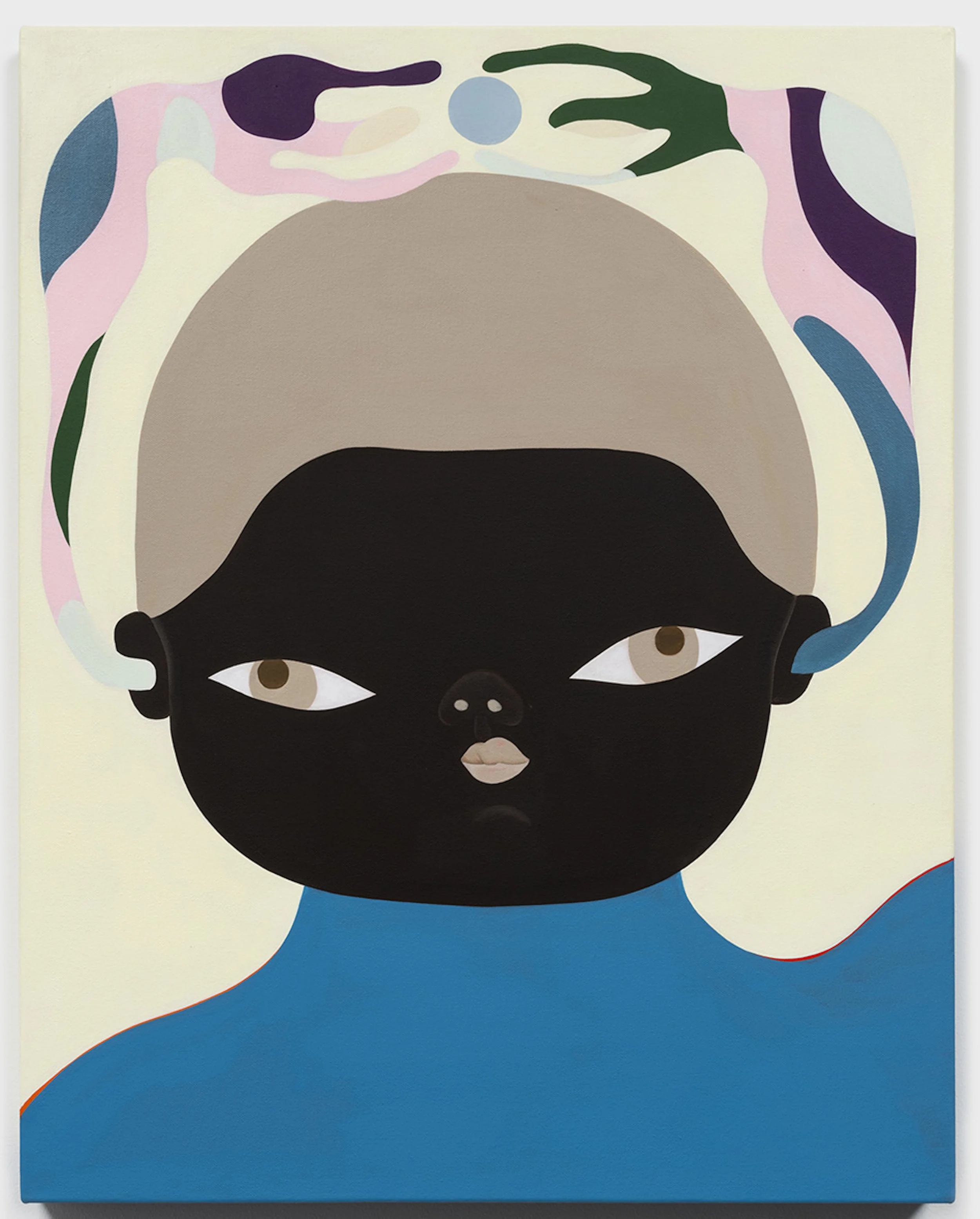 Born in Tokyo and raised between Brazil, Sweden, and the U.S., Asuka Anastacia Ogawa blends cultural memory with surreal figuration. In this painting, an androgynous, doll-like figure, characteristic of Ogawa’s work, moves across a monochromatic field. Rendered with soft edges and flattened hues, the composition recalls ritual iconography, while channeling Ogawa’s Afro-Brazilian and Japanese heritage into a quietly spiritual presence.