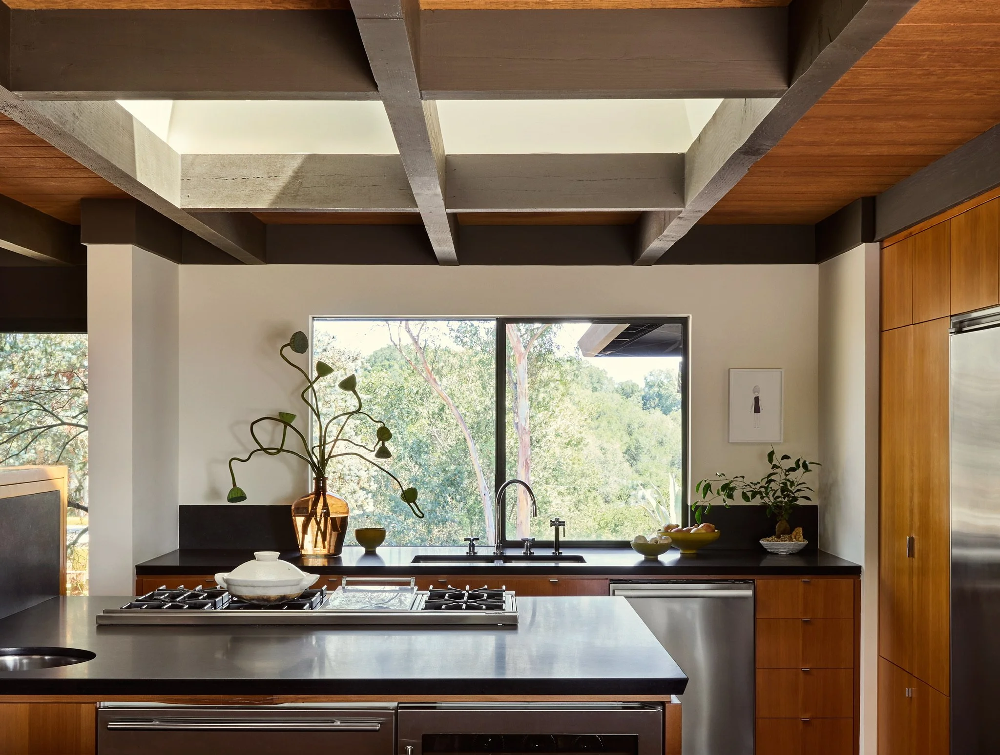 Framed by natural light and exposed beams, this midcentury kitchen balances structure and softness through material warmth and quiet details. On the far wall, Brígida Baltar’s Untitled from the Bee House series (2001) anchors the space with a sense of gentle introspection.