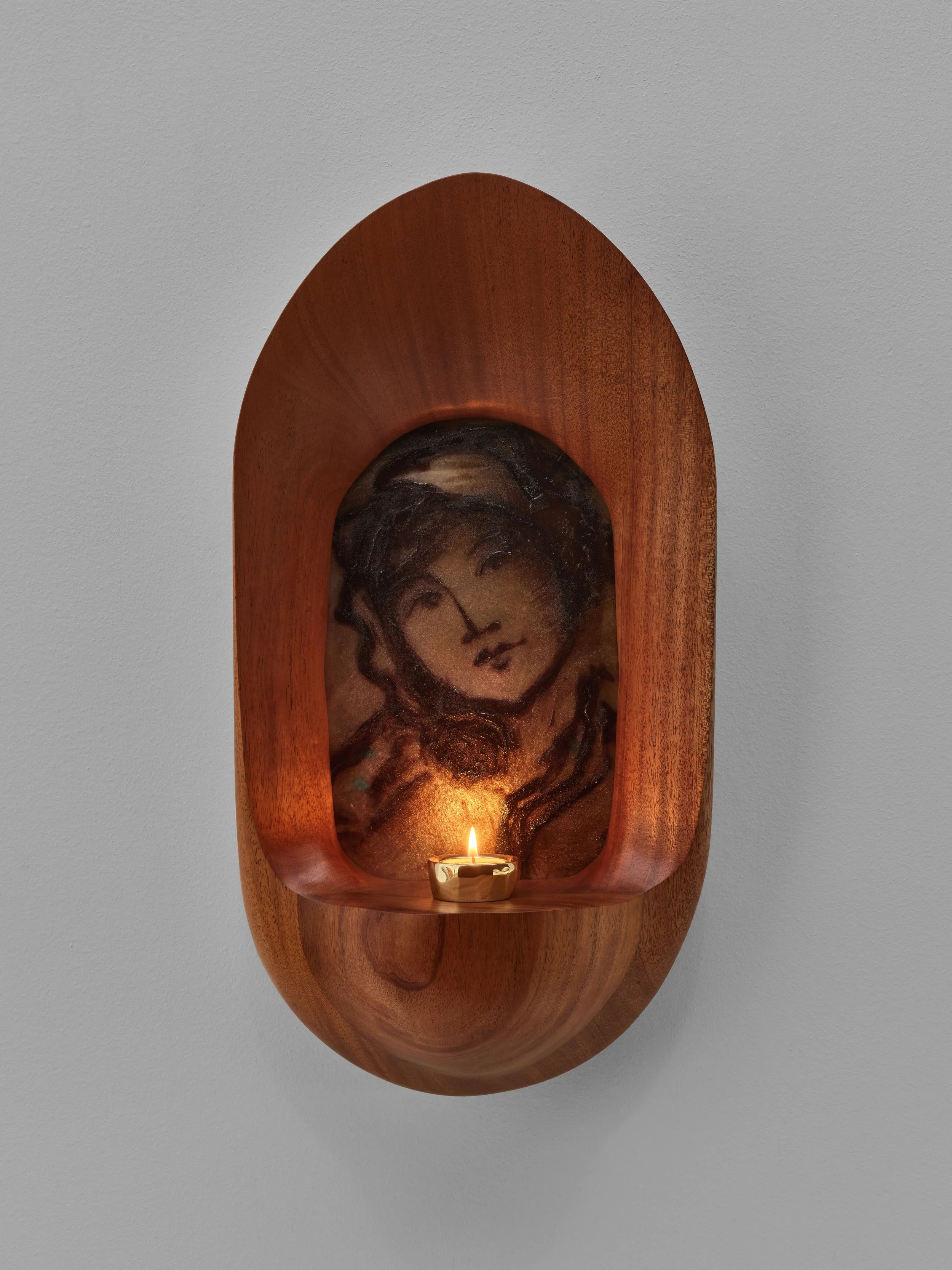 Altar is a collaborative sculpture created by Claire Tabouret and her husband Nathan Thelen. It pays homage to the celebrated artist and occultist Pamela Colman Smith (1878-1951) , recognized for her illustrations in the famous Rider-Waite Tarot deck. Tabouret skillfully translates Smith's watercolor self portraits into stained glass panels, while Thelen frames them in a hand-carved mahogany sconce. Within the sculpture, Tabouret’s delicate face emerges, softly illuminated by a small votive candle.