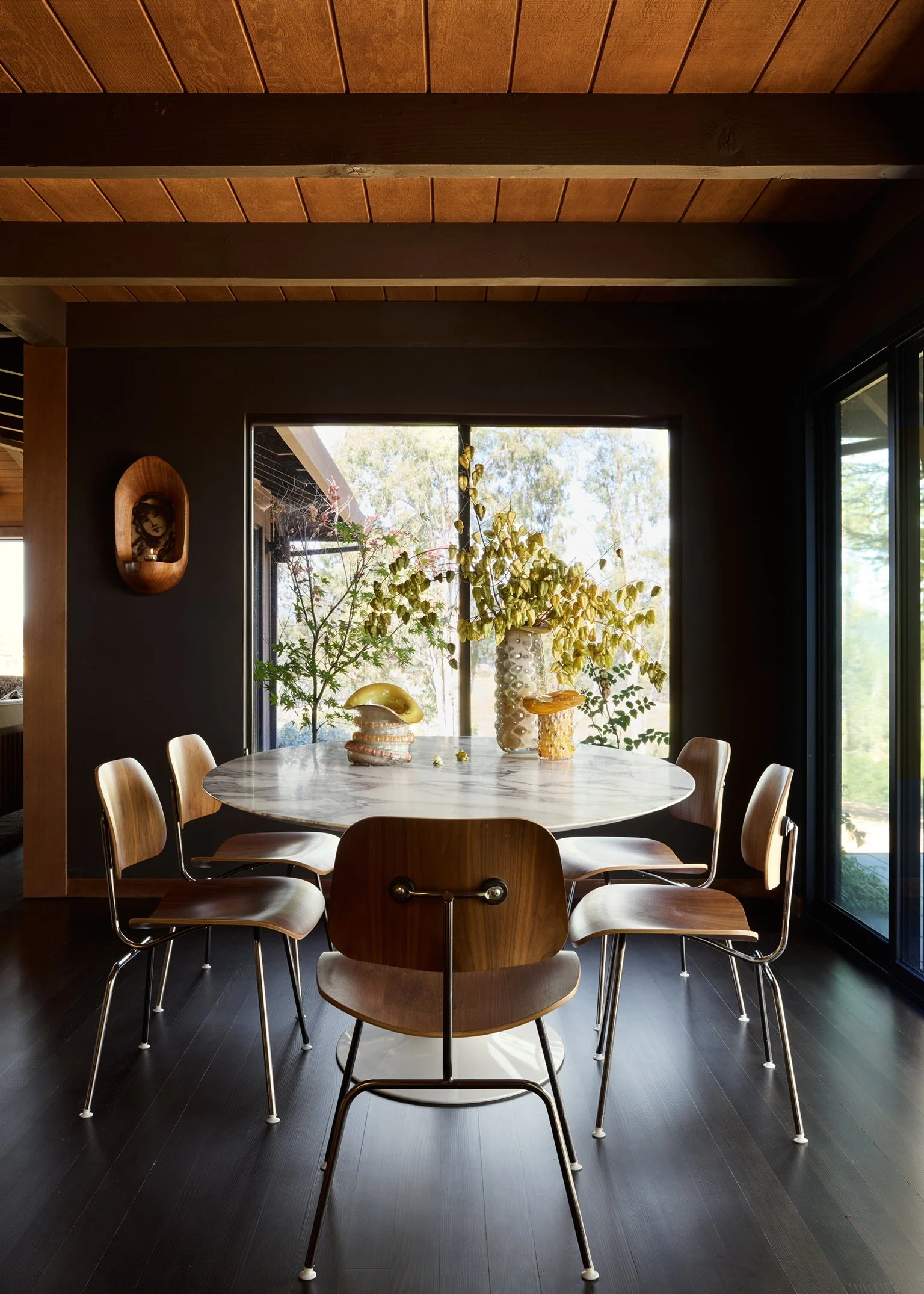 Framed by dark walls and soft daylight, the dining room brings together natural materials, sculptural vessels, and Altar (2023) by Claire Tabouret and Nathan Thelen.