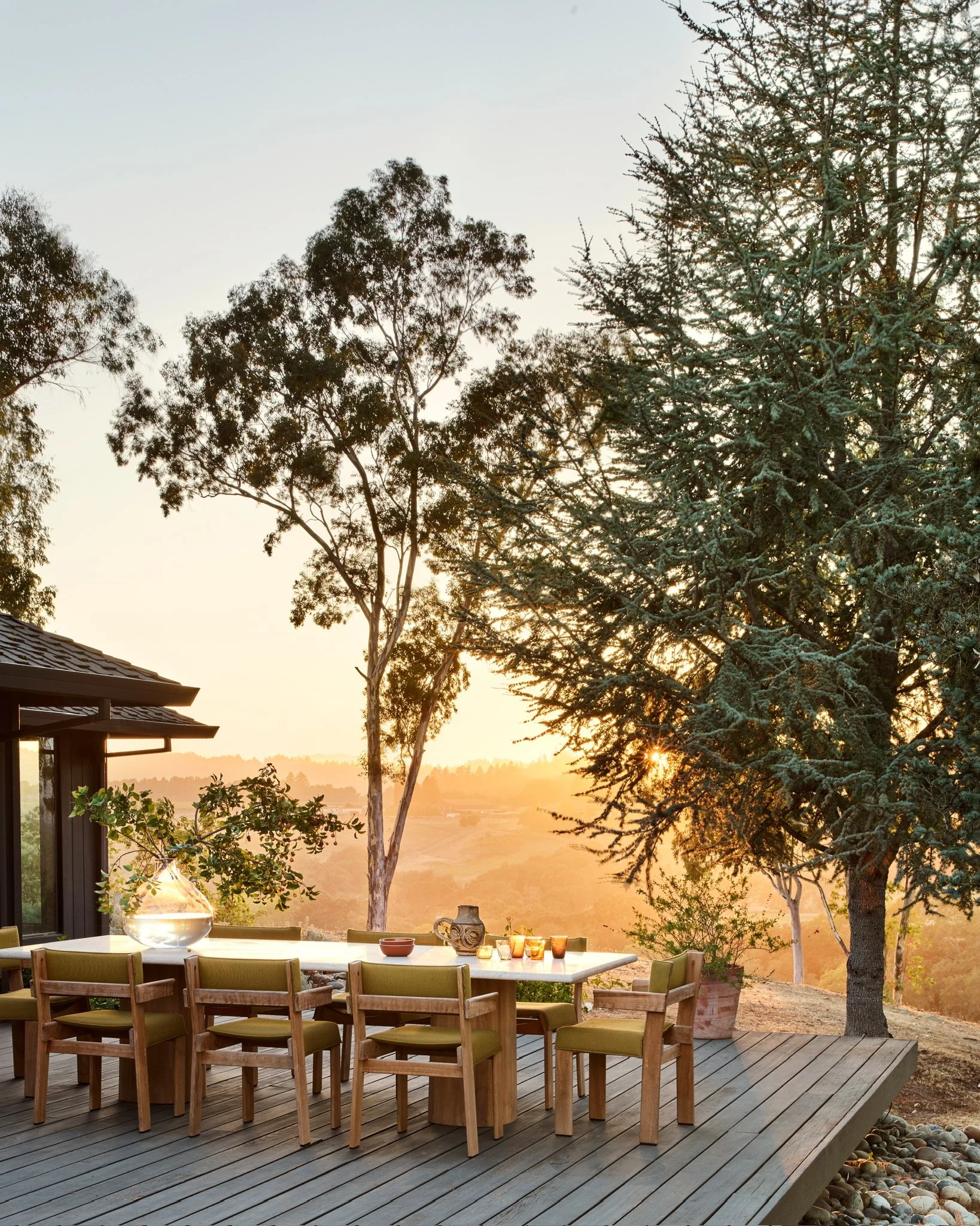 At sunset, the outdoor dining area opens to sweeping views of Sonoma’s golden hills, blurring the line between home and horizon. Natural materials and earthy tones echo the surrounding landscape, extending SVK Interior Design’s quiet, grounded sensibility into the open air.