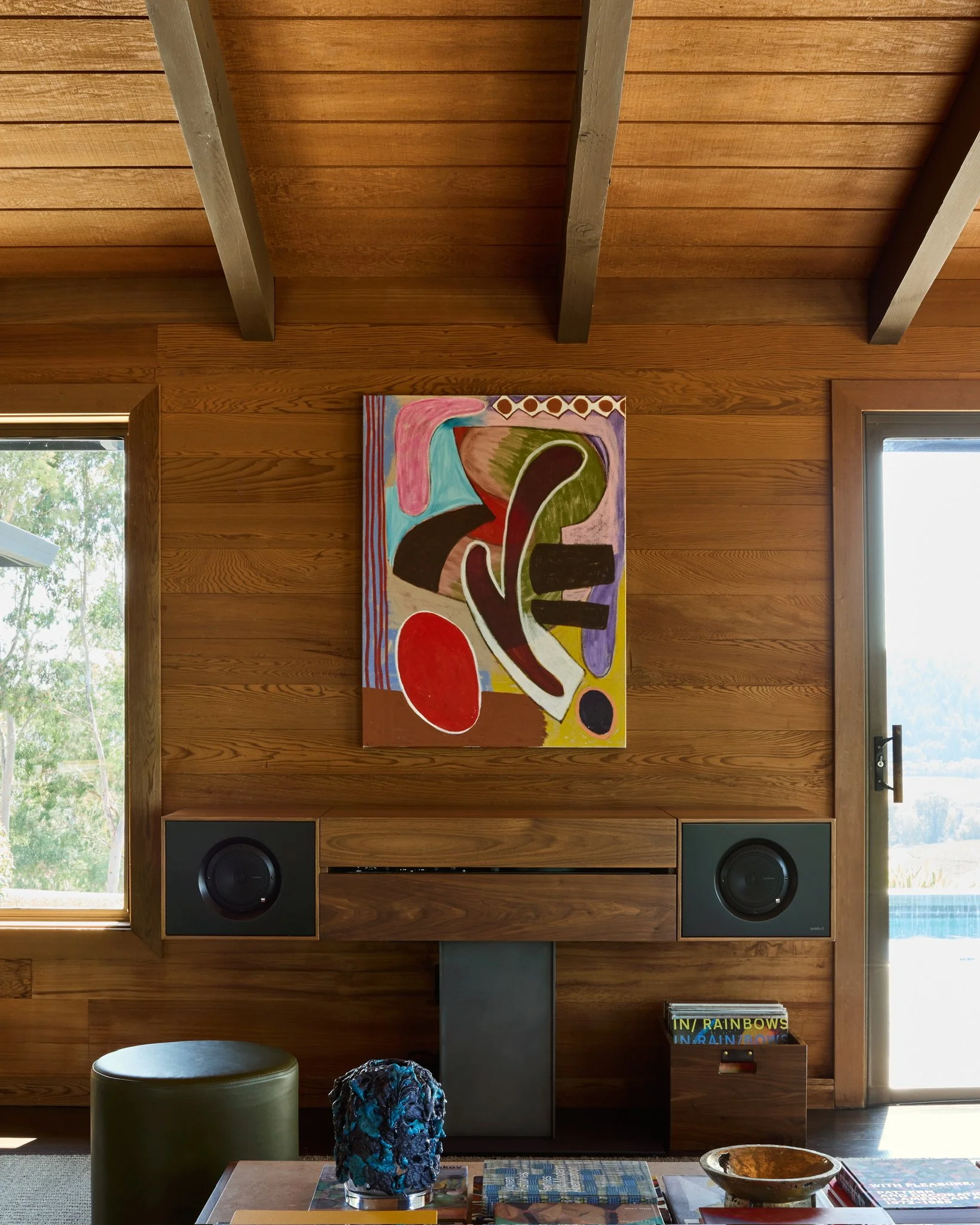 Set within cedar-clad interiors, this living space features Contactless (2021) by Hayal Pozanti, whose abstract visual language draws from poetry and code. The vibrant composition anchors the room’s rich material palette, resonating with the home’s balance of structure and spontaneity.